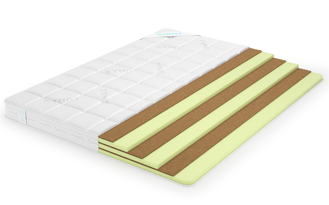 Наличие кокосовой койры толщиной 3 см. в составе придает матрасу жесткость, обеспечивает дополнительную поддержку позвоночника во время сна, формирует ортопедический эффект.