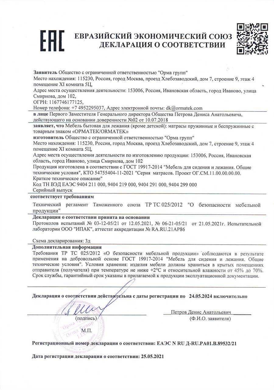 Верхнее покрытие матраса изготовлено из материала трикотаж - натуральный текстильный материал, изготавливаемый на основе хлопка, вискозы, шелка или шерсти методом переплетения систем двух нитей (основы и утка) по взаимно перпендикулярным направлениям. В результате образуется эластичное полотно с петлями. Трикотаж мягкий и приятный на ощупь. Материал получил широкое распространение в текстильной промышленности. Трикотаж используют производители матрасов для изготовления верхнего покрытия для матрасов, чехлов, наматрасников.